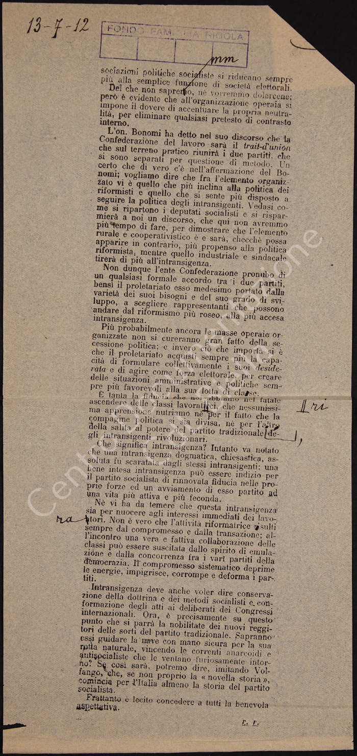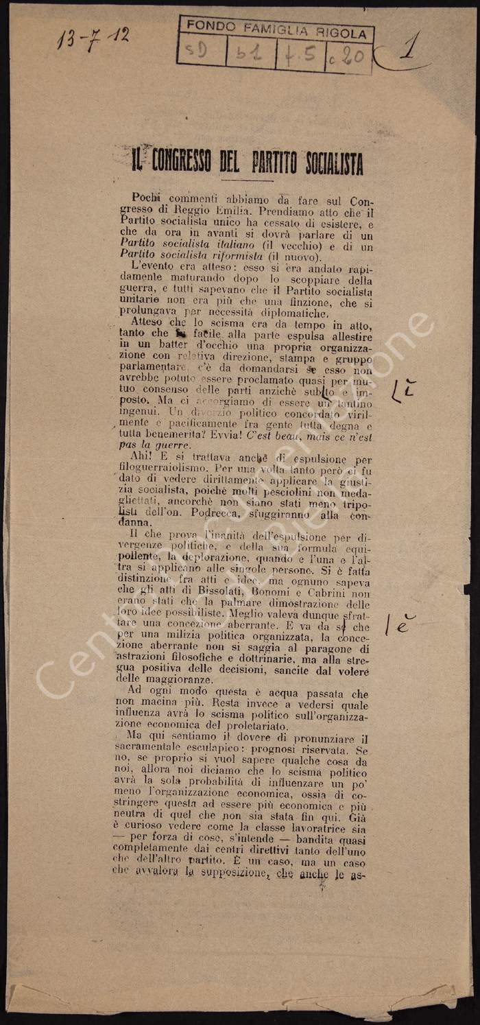 Articolo di giornale "Il congresso del partito socialista" relativo al congresso di Reggio Emilia quindi alla cessazione del Partito Socialista unico e alla nascita del Partito Socialista italiano e del Partito Socialista riformista.
