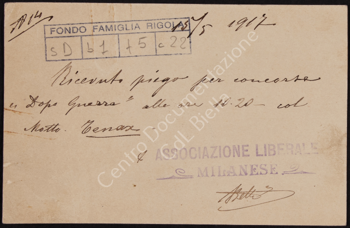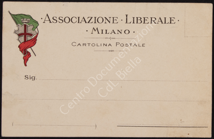 Cartolina postale "Associazione liberale Milano" per ricevuta piego per concorso. Vedi s.D b.1 f.5 c. 21