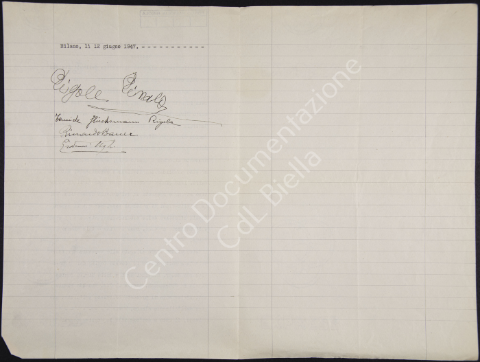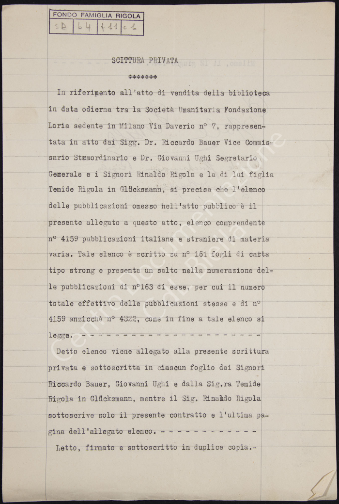 Scrittura privata in riferimento all'atto di vendita della biblioteca "tra la Società Umanitaria Fondazione Loria e i signori Rinaldo Rigola e la di lui figlia Temide Rigola in Glücksmann". Allegato elenco delle pubblicazioni.