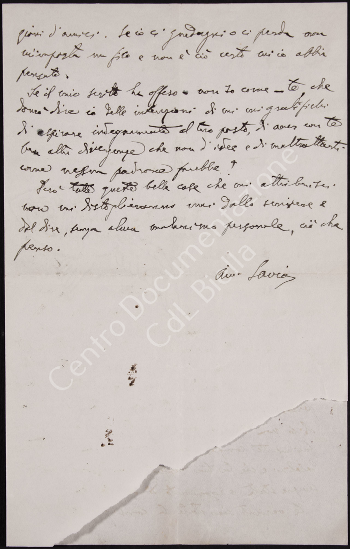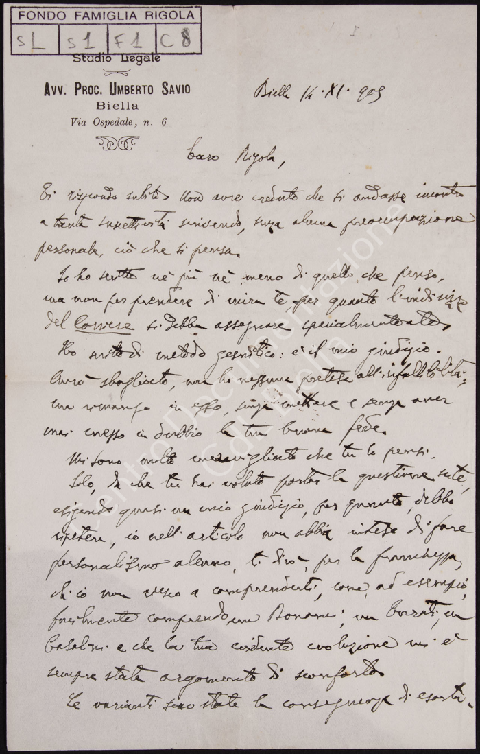 Lettera manoscritta dall'Avv. Proc. Umberto Savio di Biella a Rinaldo Rigola probabilmente in risposta ad un accusa di personalismo trapelato da un suo articolo di giornale sul "Corriere di Biella". Savio esprime la diversità di opinioni rispetto a Rigola anche in confronto con altri membri del partito quali Casalini, Rondani e Turati, rivendica la volontà di poter esprimere liberamente il proprio giudizio e pensiero.