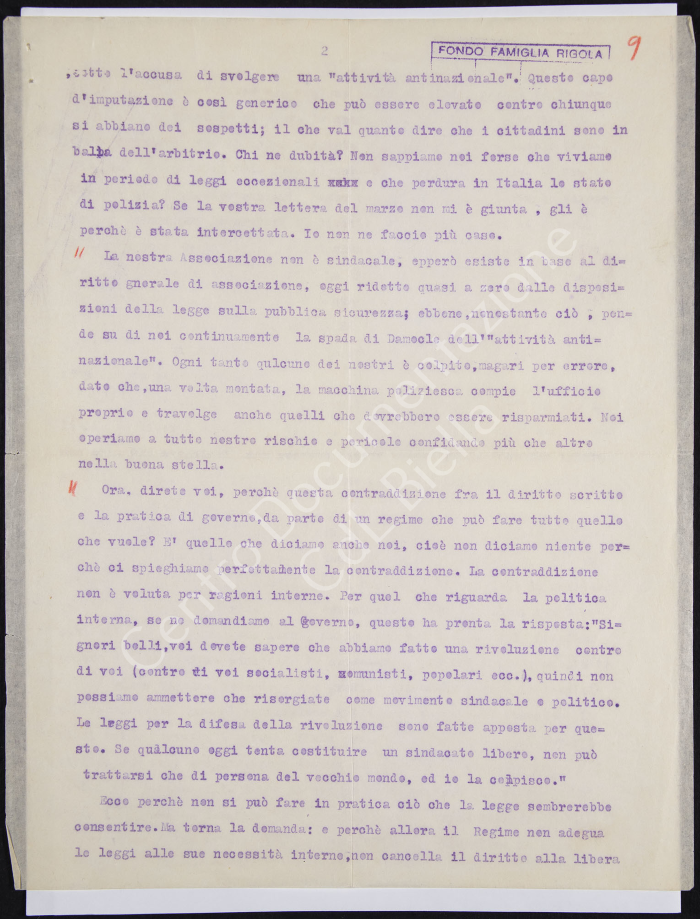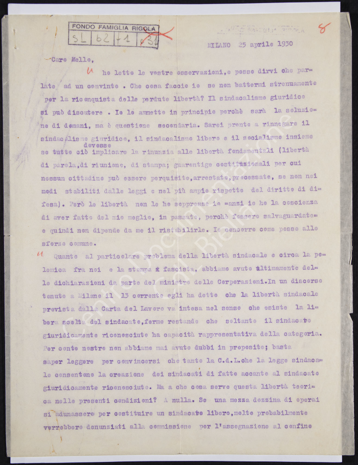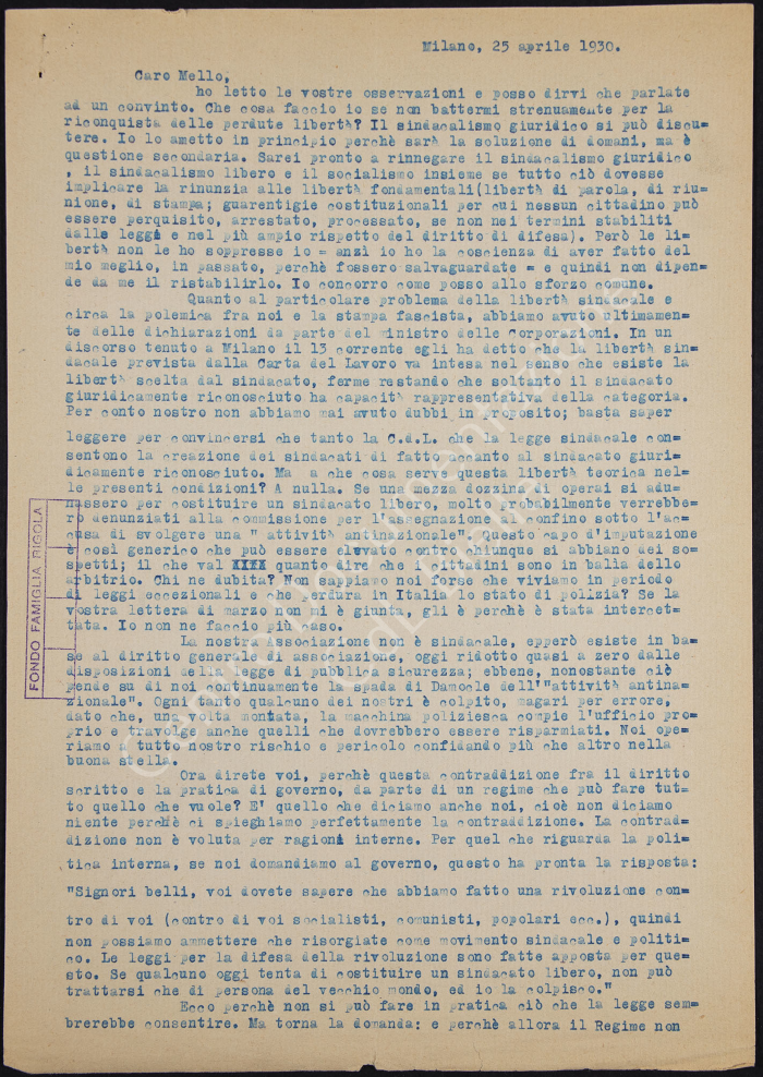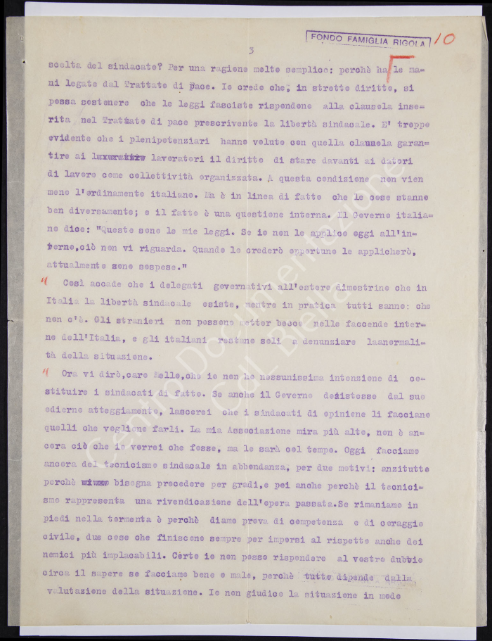 Lettera di Rigola in risposta a Mello (in doppia copia) in cui esprime le sue convinzioni riguardanti il sindacalismo giuridico ai tempi del fascismo e le contraddizioni tra il "Trattato di pace che prescrive libertà sindacale" e invece la mancanza di libertà reali (anche sindacali) in epoca fascista.
