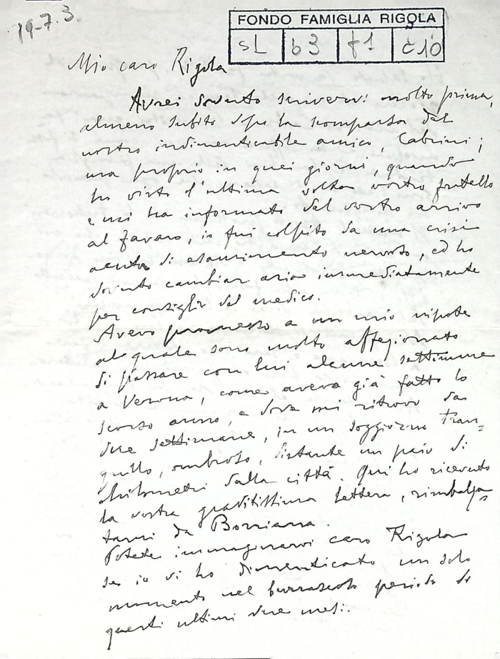 Lettera manoscritta di Silvio Becchia a Rinaldo Rigola