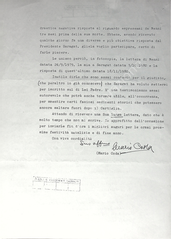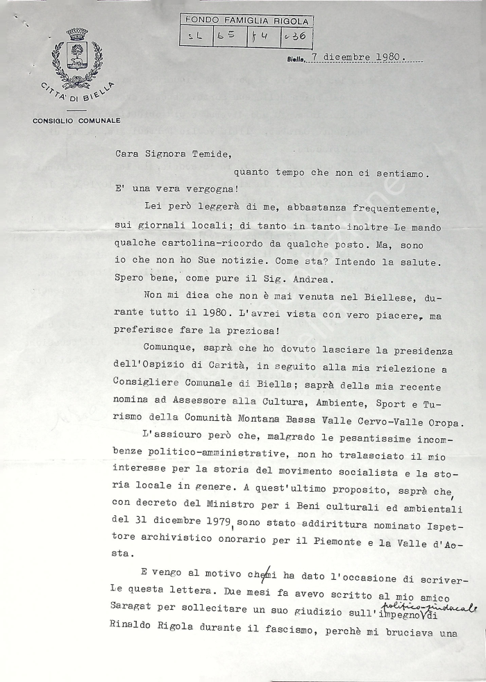Mario Coda scrive a Temide Glücksmann Rigola aggiornandola su tutti i suoi impegni lavorativi e la informa dell'invio di uno scambio di lettere con Nenni (Pietro) e Saragat (Giuseppe) utili a chiarire la posizione di Rigola durante il fascismo.