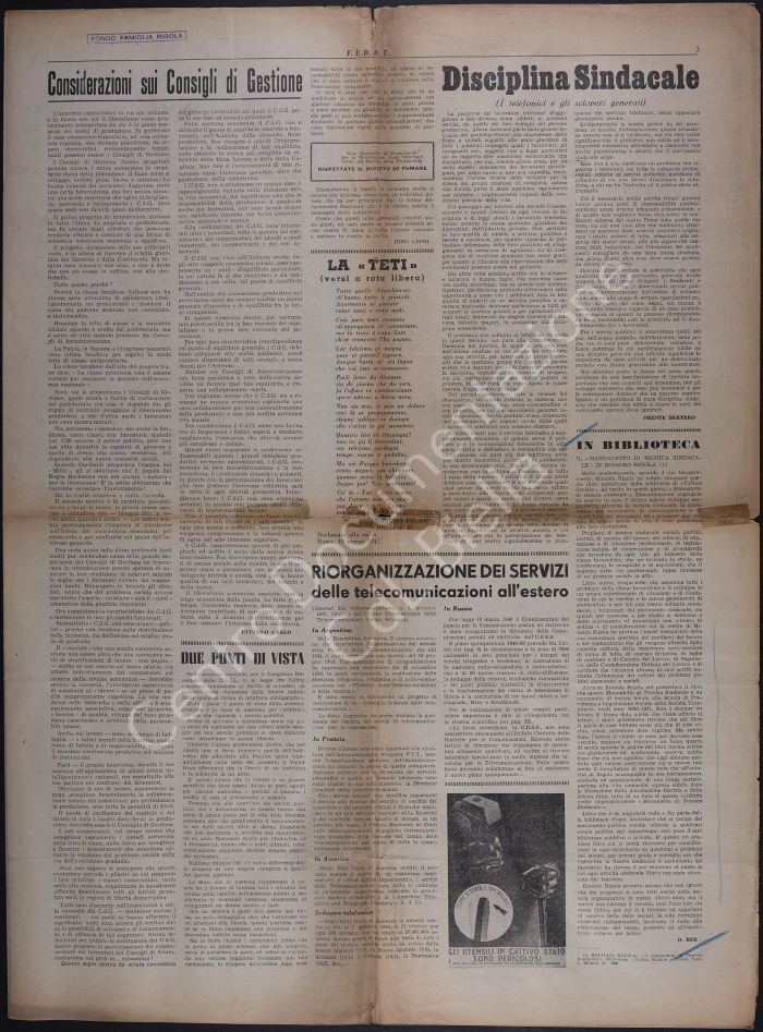 Periodico, organo della federazione dei lavoratori delle telecomunicazioni, numero completo. Pubblica una recensione del "Manualetto di tecnica sindacale" di Rinaldo Rigola a cura di Oreste Bertero.