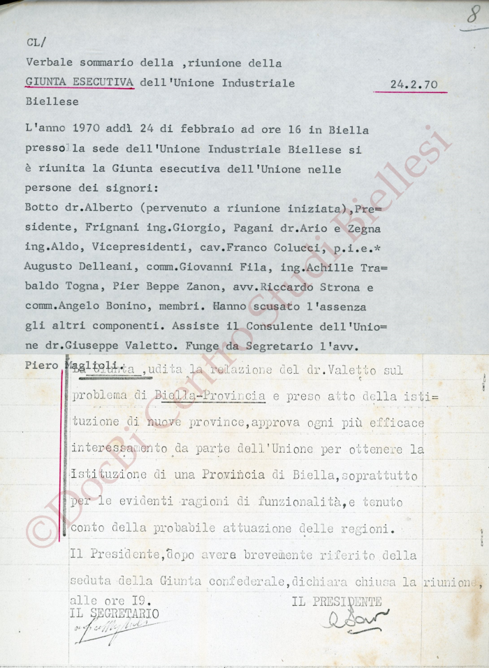 Documentazione varia relativa alla proposta di istituzione della provincia di Biella (rassegna stampa, relazioni varie sul Biellese, mappe, proposte di legge, leggi ecc.). Da notare il dossier "La provincia di Biella", stilato a cura della Città di Biella (Biella, 21 marzo 1970); l'opuscolo "Autonomia amministrativa per il territorio lecchese. Riunioni dei rappresentanti delle organizzazioni economiche e professionali", relazione della Commissione di Studio Rotariana (Rotary Club di Lecco, Casa Editrice Guido Stefanoni, Lecco, 5 settembre 1968); il dattiloscritto "Biella, città del Piemonte", memoria letta dal Comm. Gino Pavia, Presidente del Rotary Club di Biella nel corso della riunione interclub a Torino del 10 ottobre 1957 (tra il Rotary Club di Torino e quello di Biella); l'opuscolo "Studio sulle autonomie locali con speciale riferimento al Piemonte e alla prov. di Vercelli" (maggio 1948); l'opuscolo "La provincia di Biella. Studio ed osservazioni in merito ad un progetto di sua costituzione" (Ufficio Studi UIB, maggio 1955);