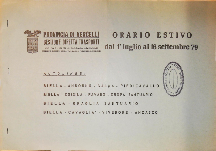 "Orario estivo dal 1 luglio al 16 settembre 1979 Autolinee Biella-Andorno-Balma-Piedicavallo, Biella-Cossila-Favaro-Oropa Santuario, Biella-Graglia santuario, Biella-CavagliĆ -Viverone-Anzasco";