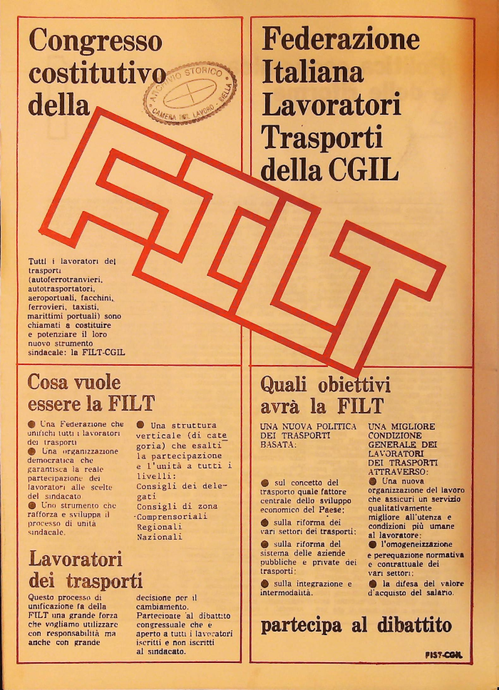 Presso la Camera del Lavoro di Biella esistevano quattro federazioni: FIAI (Federazione italiana autoferrotranvieri e internavigatori), SFI (Sindacato ferrovieri italiani), FIST (Federazione italiana sindacati trasporti) e FIFTA (Federazione italiana facchini trasportatori e ausiliari): nel 1980 queste sigle sono state unificate, insieme ad altre, per dare vita alla FILT / CGIL.