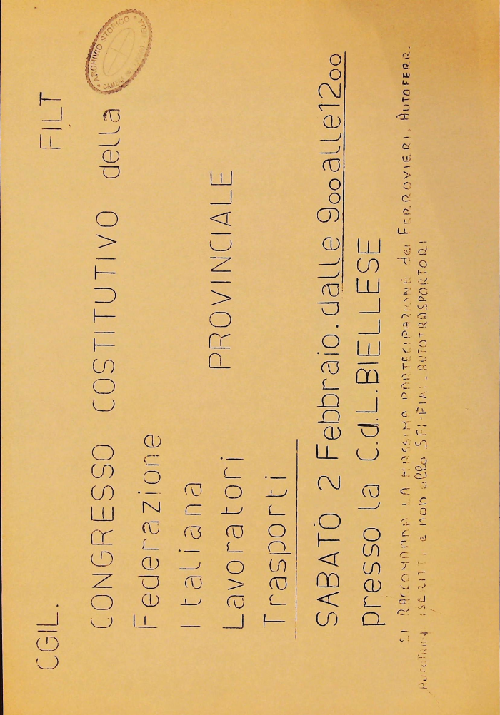 Documentazione relativa al Congresso costitutivo della Federazione italiana lavoratori trasporti (FILT / CGIL) tenutosi a Biella il 2 febbraio 1980; si segnala verbale del congresso, supplemento al n. 10 del giornale Rassegna Sindacale in merito alla costituzione della FILT, organigramma della FILT Biella, volantini, schede per elezione del Direttivo FILT di Biella, copia del giornale F.I.S.T. (Roma , 4-5 dicembre 1979).