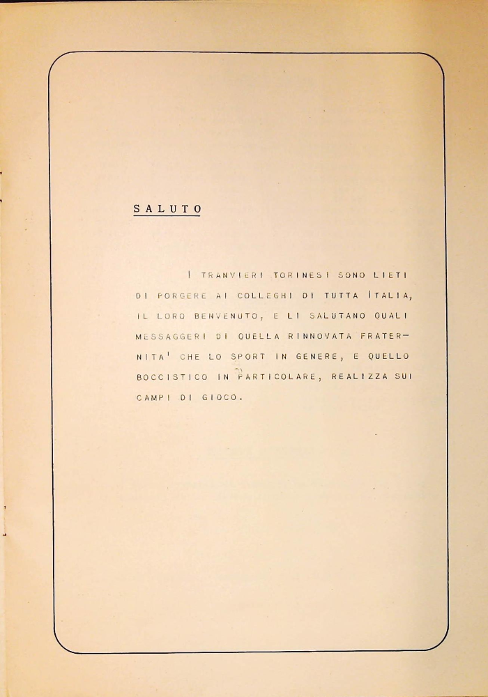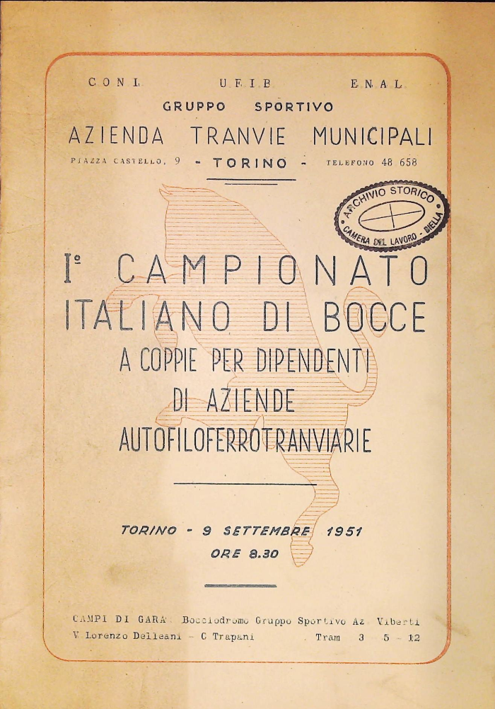 Si segnala opuscolo del 1° Campionato italiano di bocce a coppie per dipendenti di aziende autofiloferrotranviarie (Torino, 9 settembre 1951).