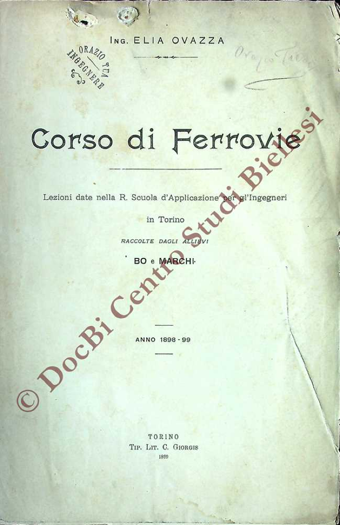 Lezioni (in dispense poi stampate e rilegate dalla Tipografia e Litografia C. Giorgis) tenute dall'ing. Elia Ovazza "raccolte dagli allievi Bo e Marchi con 314 figure intercalate nel testo".