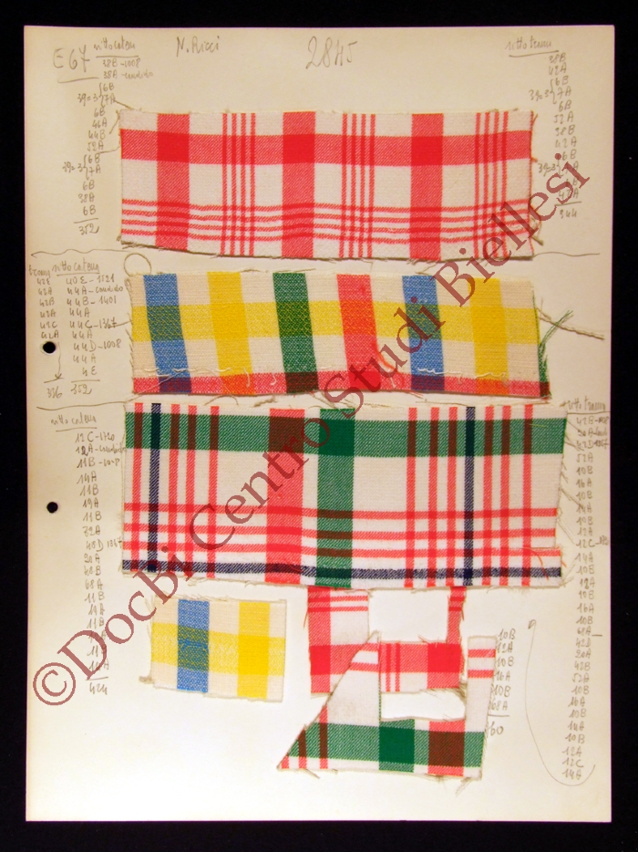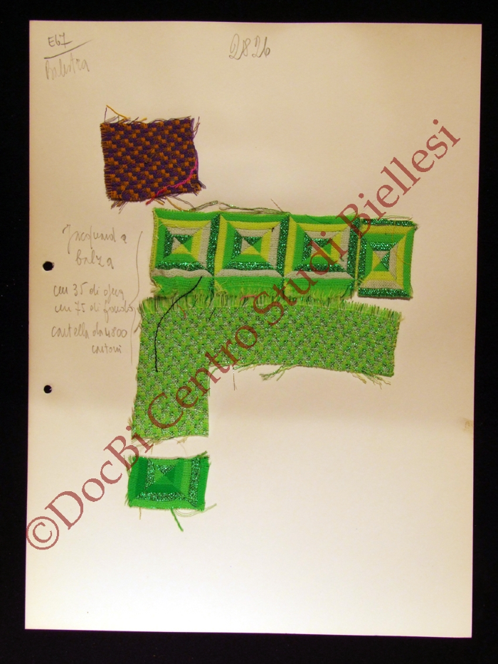 E' un campionario con tessuti che hanno tonalità sia chiare che scure e fantasie di diverso tipo. Va dal numero 2801 al 2848. Di fianco ad alcuni campioni sono presenti note tecniche di tessitura ed è specificato l'atelier a cui sono destinati: