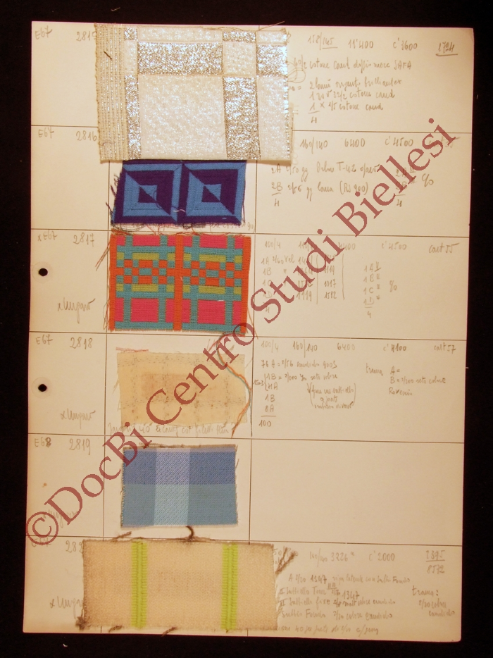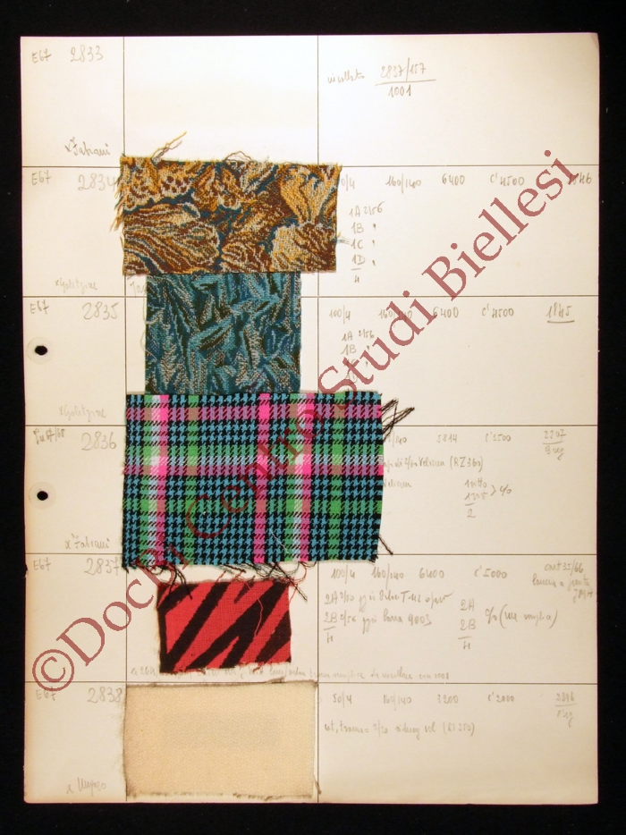 E' un campionario tecnico, con tessuti che hanno tonalità accese e fantasie di diverso tipo. Va dall'articolo 2701 all'articolo 2862. Sono presenti vicino ai campioni le note tecniche di tessitura corrispondenti ed è specificato l'atelier a cui sono destinati: