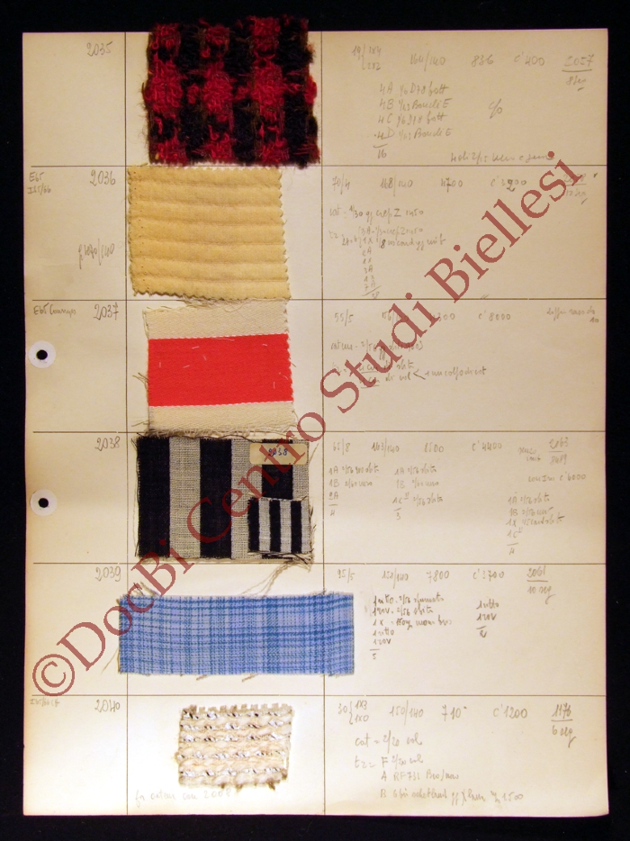 E' un campionario tecnico, con tessuti che hanno tonalità accese e fantasie di diverso tipo. Va dall'articolo 1999 al 2202. Sono presenti vicino ai campioni le note tecniche di tessitura corrispondenti.