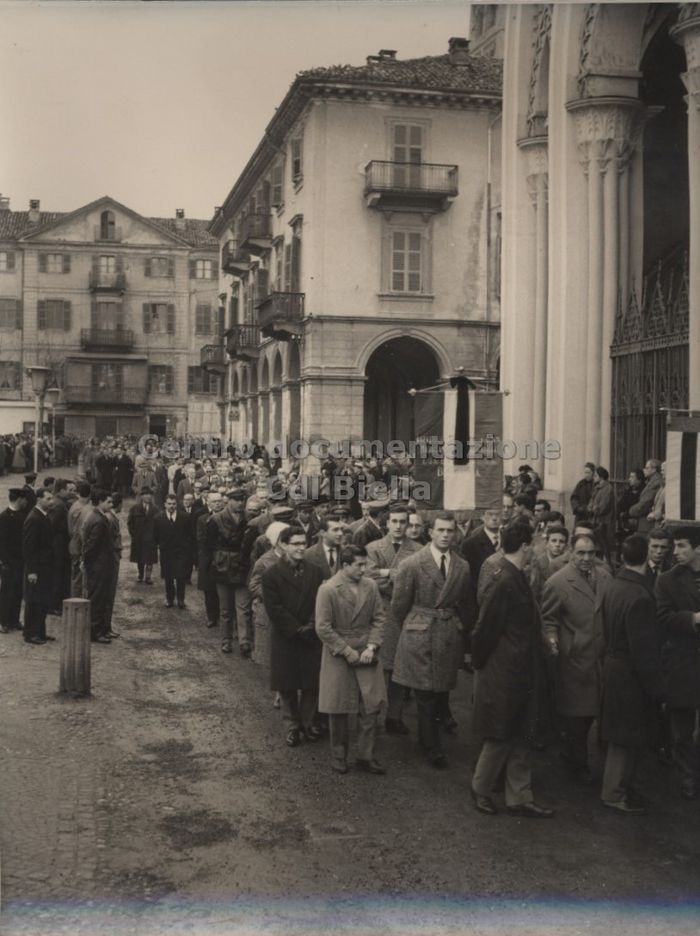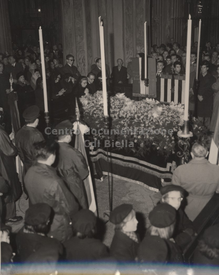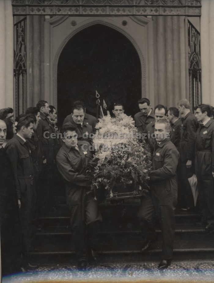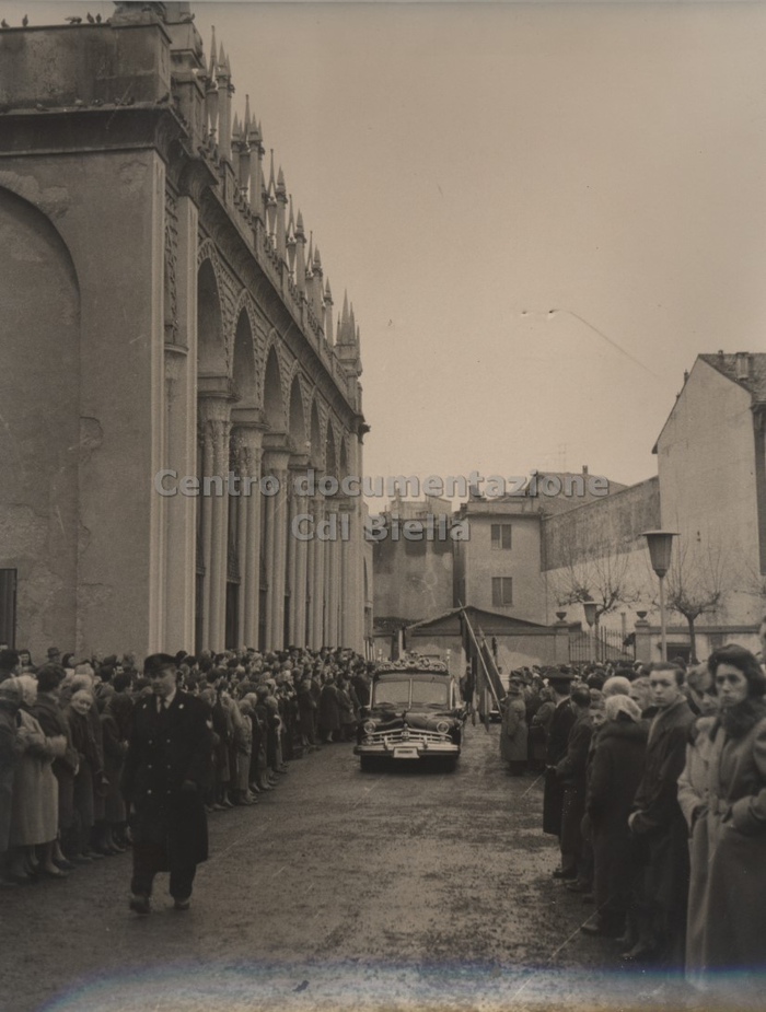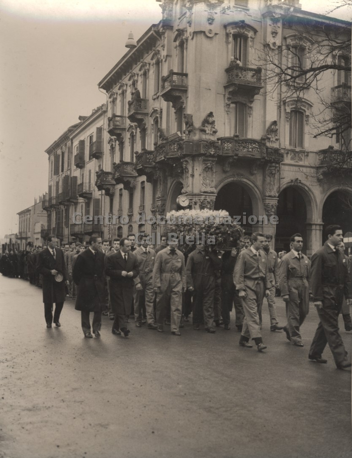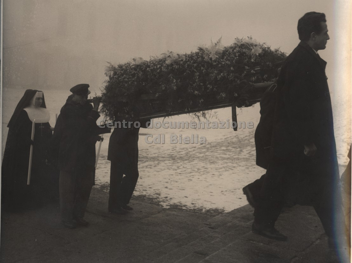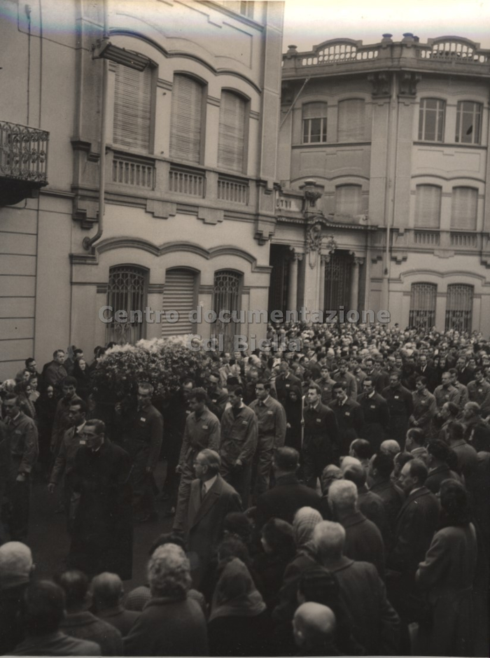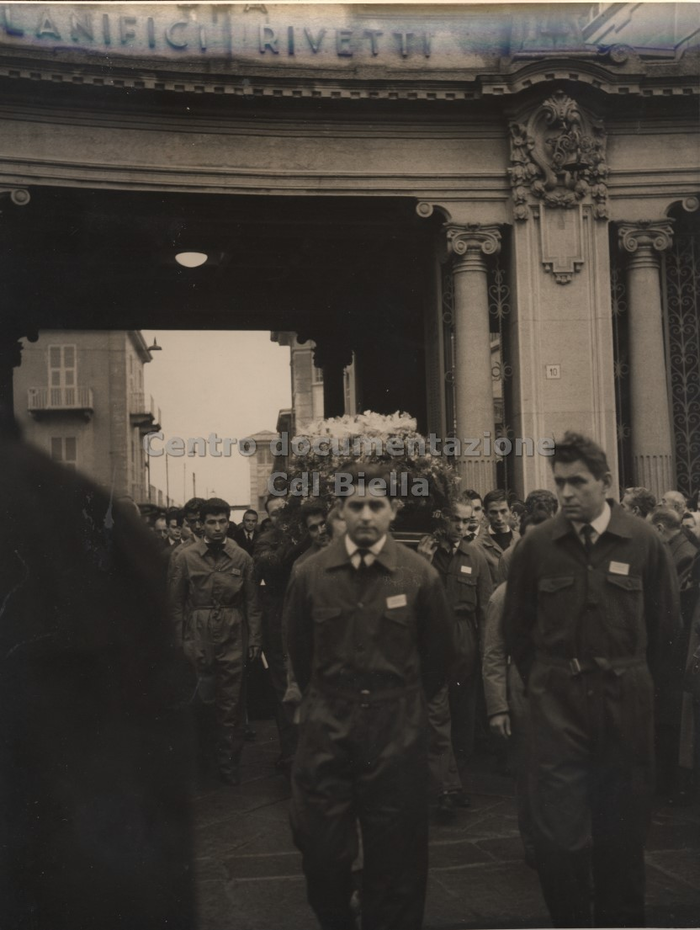 Documentazione fotografica del funerale di Oreste Rivetti; le immagini documentano il percorso del feretro condotto a spalle dagli operai. Il corteo funebre partì dai Lanifici e percorrendo via Repubblica, viale Matteotti, via Italia, giunse in duomo. Ulteriori immagini sono state scattate all'interno della chiesa durante il rito e all'uscita del feretro e del corteo.