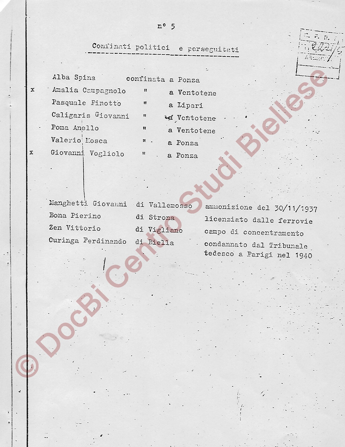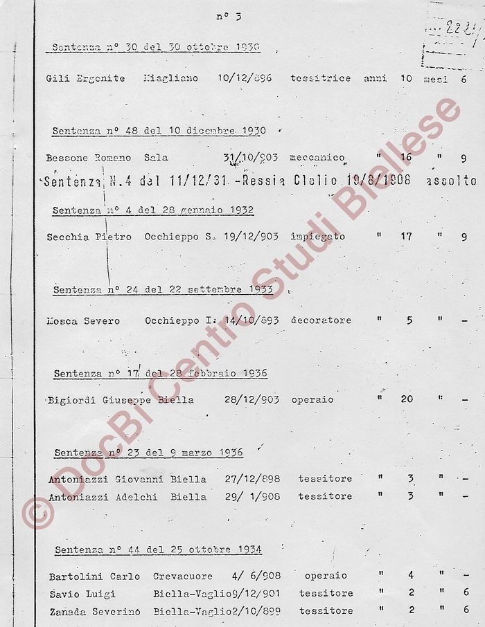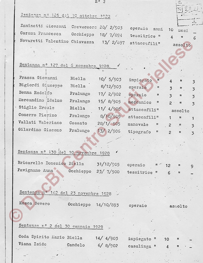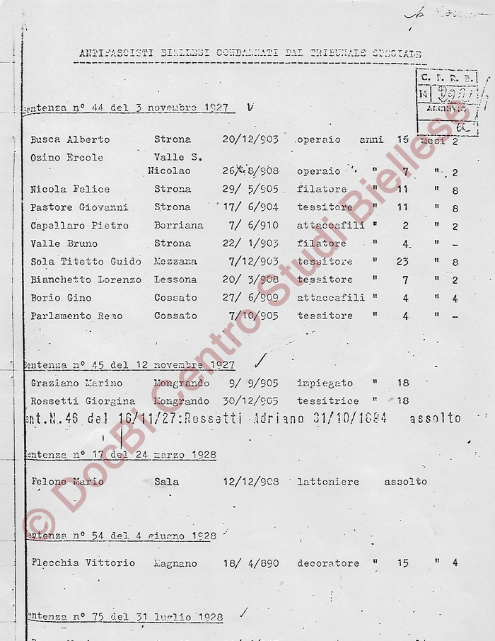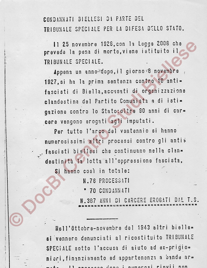 Elenco generale dei biellesi processati e condannati dal Tribunale Speciale per di Difesa dello Stato: