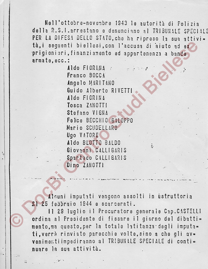 Interessante l'elenco dei denunciati nell'ottobre-novembre 1943 (sono quattordici, ma Aldo Fiorina è indicato due volte). Tra i citati accusati dalla R.S.I di attività sovversive (aiuto a ex prigionieri, finanziamento e appartenenza a bande armate ecc.) si trovano anche Guido Alberto Rivetti, Felice Becchio Galoppo e Aldo Blotto Baldo.