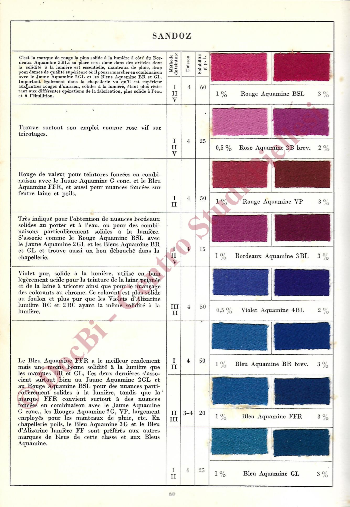 Campionario Sandoz sulla tintura delle lana con i coloranti acidi e Alizarina acidi. Oltre ai campioni e alle relative ricette sono presenti brevi note sui procedimenti di tintura. In francese.