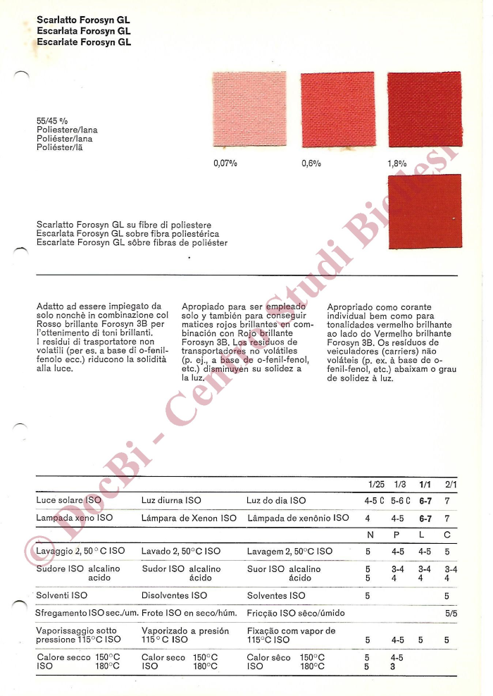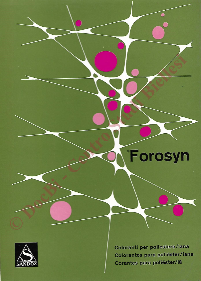 Campionario Sandoz sui coloranti Forosyn per la tintura di misti poliestere/lana. Oltre ai campioni e alle relative ricette sono presenti ampie note sui procedimenti di tintura. In italiano, spagnolo e portoghese.