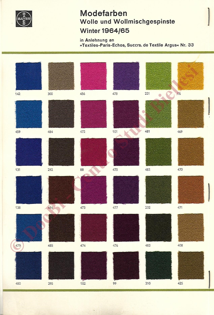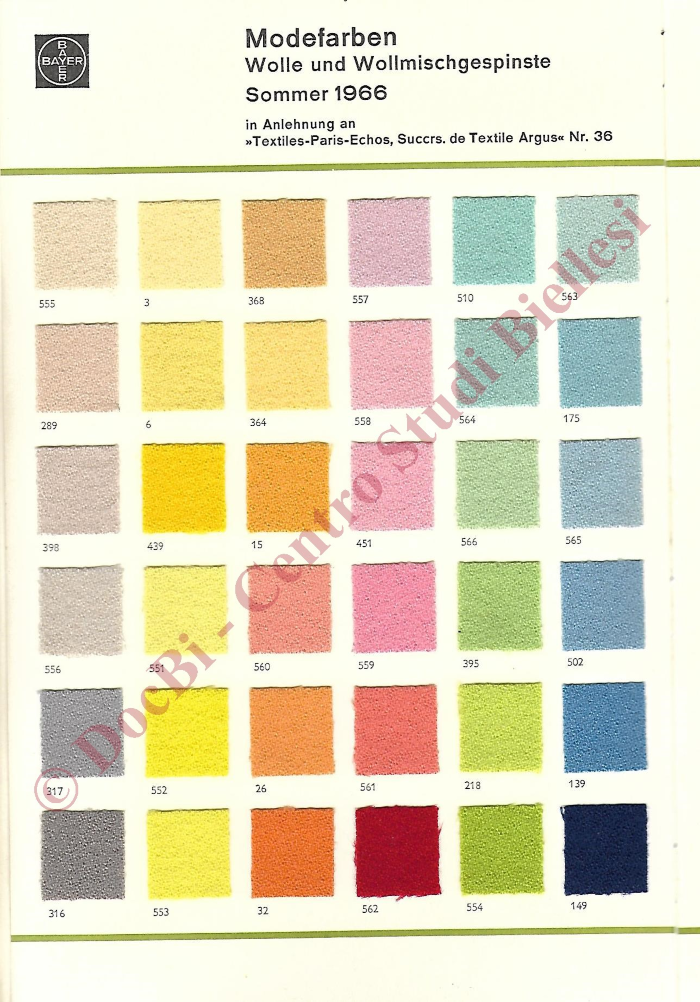 Bayer. Presentazione dei nuovi colori di tendenza dall'estate 1963 all'estate 1966 di lana e misti lana. Campioni con le ricette di tintura. In tedesco.