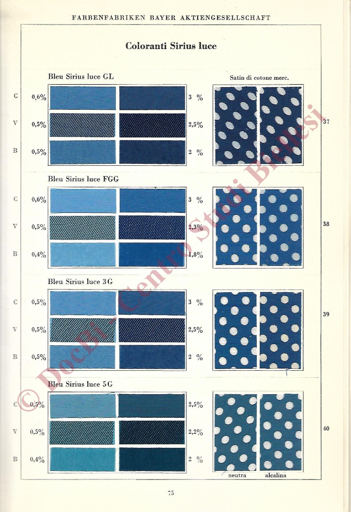 Campionario Bayer sui coloranti Sirius e Sirius luce sul cotone. Oltre ai campioni e alle relative ricette sono presenti ampie note sui procedimenti di tintura.