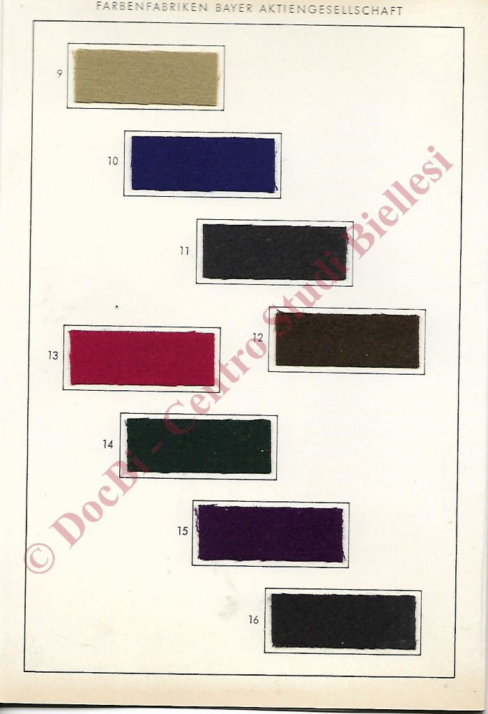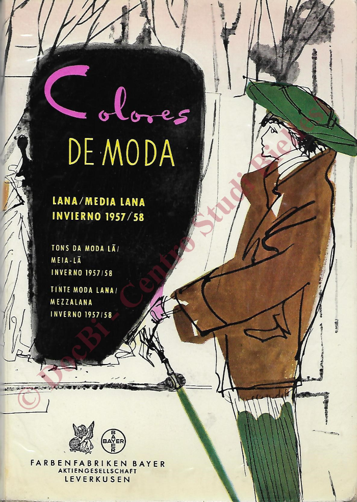 Piccolo campionario Bayer dei colori alla moda su lana/mezzalana per l'inverno 1957/58. In spagnolo, portoghese e italiano.