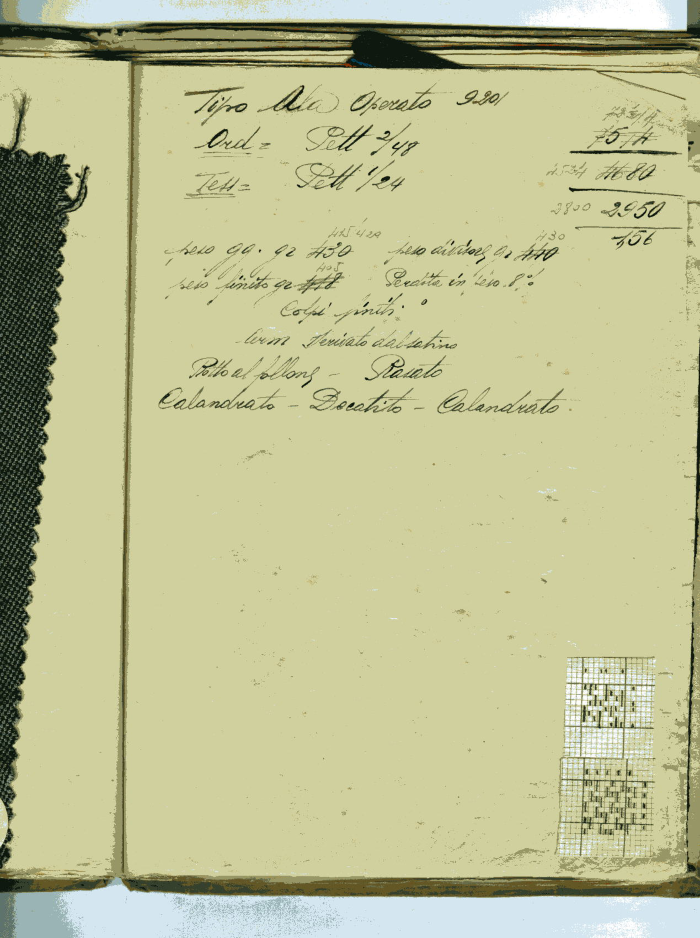 Campionari: campioni di stoffa di diverse misure (alcuni con etichetta con numero di riferimento), fogli millimetrato con disegno della trama e dell'ordito, e appunti tecnici scritti a biro o matita.