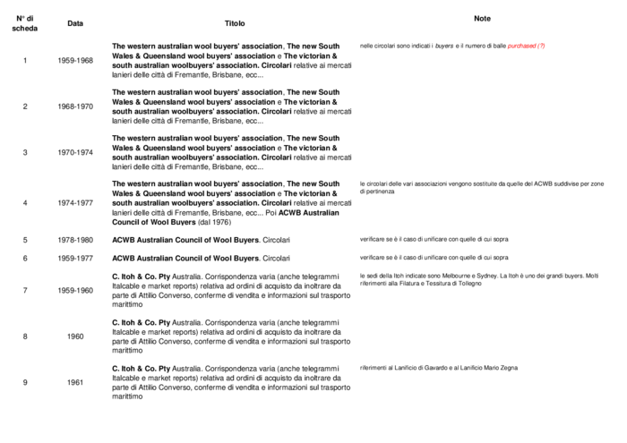 La documentazione riguarda l’attività di rappresentanza, importazione e vendita di lane della ditta Attilio Converso Lane di Biella. L’ufficio era gestito dapprima da Attilio Converso, fondatore della ditta nel 1946, e poi dal figlio Mario. Il Fondo Attilio Converso Lane è composto principalmente da carteggio commerciale e da documenti tecnico-contabili generati dai rapporti tra l’ufficio di Biella e le “case” di commercio laniero australiane, belghe, francesi, giapponesi e inglesi per le quali i Converso agivano in qualità di rappresentanti. Interessante anche la documentazione (cronologicamente antecedente alla fondazione della ditta) inerente gli incarichi assunti da Attilio Converso negli anni ’30 in seno all’Istituto Commerciale Laniero Italiano di Milano e alla Società Anonima Italiana Sindacato Americano di Biella. Allegate alle carte si trovano un’importante raccolta di pubblicazioni tecniche («Wool Records», «Bollettino della Associazione Laniera», ecc.) e una collezione di campioni di lane sucide di provenienza australiana.