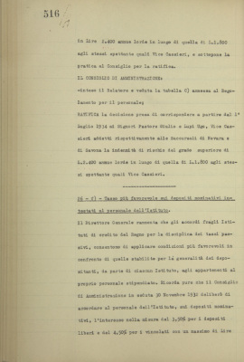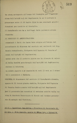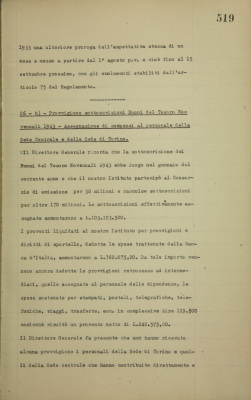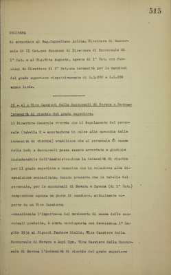 Provvedimenti vari in materia di personale: ricorsi per la revisione delle qualifiche dell'anno 1933; trasferimenti al personale di ruolo; Barale Alessio, dirigente dell'agenzia di Venaria Reale, provvedimenti; Cappellano Andrea, Riva Augusto, indennità per le funzioni del grado superiore; vice cassieri delle succursali di Novara e Savona, indennità di rischio del grado superiore; tasso più favorevole sui depositi nominativi intestati al personale dell'Istituto; Balduini Aldo, domanda di proroga di aspettativa per motivi di salute; provvigione sottoscrizioni Buoni del Tesoro novennali 1943, assegnazione di compensi al personale della sede centrale e della sede di Torino