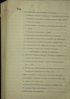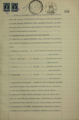 Comunicazioni del presidente: situazione dei conti dell'azienda bancaria; operazioni di fido deliberate dal Comitato esecutivo; Istituto Nazionale gestione imposte di consumo (INGIC). Ricostruzione del Consiglio di amministrazione