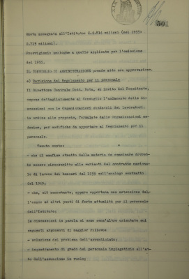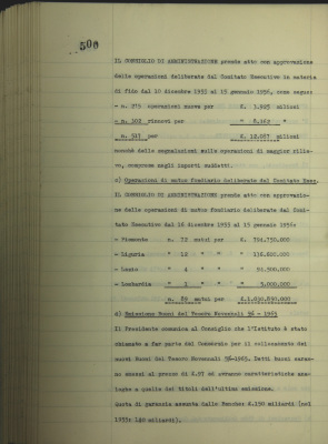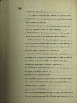 Comunicazioni del Presidente: situazione dei conti dell'Azienda bancaria; operazioni di fido e di mutuo fondiario deliberate dal Comitato esecutivo; emissioni Buoni del Tesoro novennali 5%, 1965; revisione del regolamento per il personale; agende e monografie per il 1957