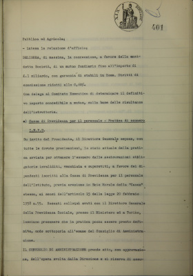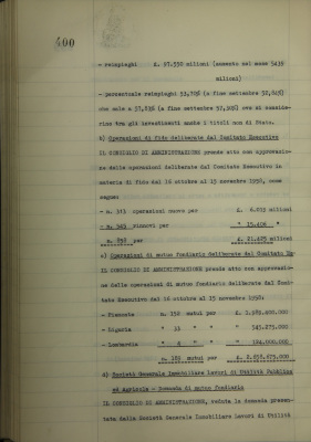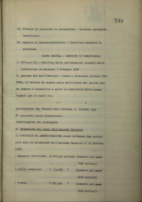 Comunicazioni del Presidente: situazione dei conti dell'Azienda bancaria; operazioni di fido e di mutuo fondiario deliberate dal Comitato esecutivo; Società Generale Immobiliare Lavori di utilità pubblica ed agricola, domanda di mutuo fondiario; Cassa di Previdenza per il personale, pratica di esonero I.N.P.S.