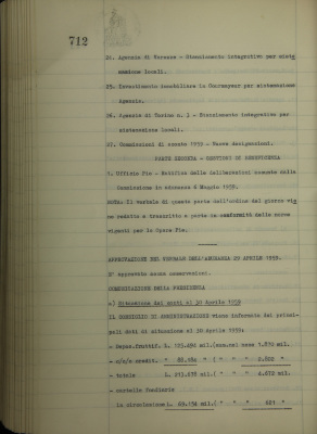 Comunicazioni della Presidenza: situazione dei conti al 30 aprile 1959; incremento percentuale depositi dal 1° gennaio al 31 marzo 1959; operazioni di fido e di mutuo fondiario deliberate dal Comitato esecutivo; IFAGRARIA S.p.A., quota di partecipazione dell'Istituto; visite a banche estere; accordo per finanziamenti alle medie e piccole industrie della Provincia di Torino; riorganizzazione servizi e uffici centrali