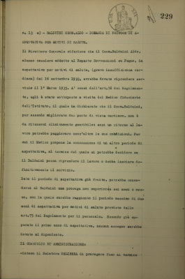 Balduini Aldo, domanda di proroga di aspettativa per motivi di salute