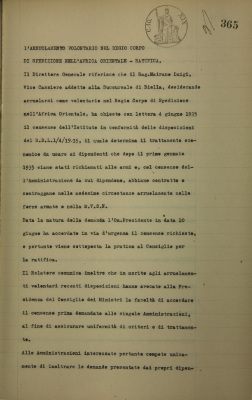 Mairano Luigi, vice cassiere. Consenso all'arruolamento volontario nel Regio Corpo di spedizione nell'Africa Orientale. Ratifica