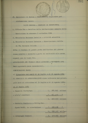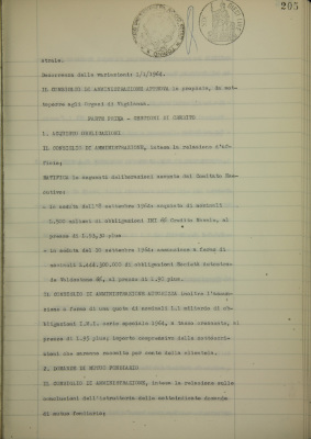 Comunicazioni varie: situazione dei conti al 31 luglio e agosto 1964; operazioni di fido e di mutuo fondiario deliberate dal Comitato esecutivo; revisione dei compensi ai consiglieri e ai sindaci