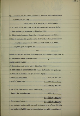 Comunicazioni varie: situazione dei conti al 31 dicembre 1964; operazioni di fido e di mutuo fondiario deliberate dal Comitato esecutivo; Banca Subalpina S.p.A.