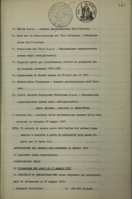 Comunicazioni varie: situazione dei conti al 31 maggio 1967; operazioni di fido e di mutuo fondiario deliberate dal Comitato esecutivo: operazioni di credito personale; Credito fondiario, assegnazioni sulla legge 1/11/1965 n. 1179; contributo alla vedova del dott. Giuseppe Gaiottino; Istituto Salesiano di Oulx