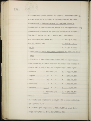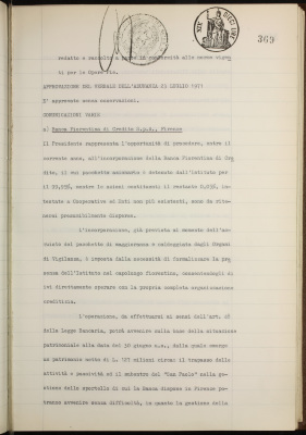 Comunicazioni varie: Banca Fiorentina di Credito S.p.A. - Firenze; Banca Depositi e Sconti S.p.A. - Milano; Banca Subalpina S.p.A. - Torino; situazione di liquidità; trattamento economico del direttore generale; commissione consiliare per il personale; situazione dei conti al 31 luglio 1971; operazioni di fido e di mutuo fondiario deliberate dal Comitato esecutivo