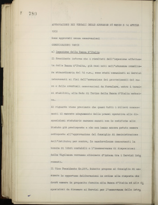 Comunicazioni varie: ispezioni della Banca d'Italia; Banco G.& A. F.lli Santi, Bologna; FIUNIVER - Fondazione industria università, Torino; Autostrada dei Fiori S.p.A., nuovo accordo sociale; situazione dei conti al 31 marzo 1972; operazioni di fido e di mutuo fondiario deliberate dal Comitato esecutivo