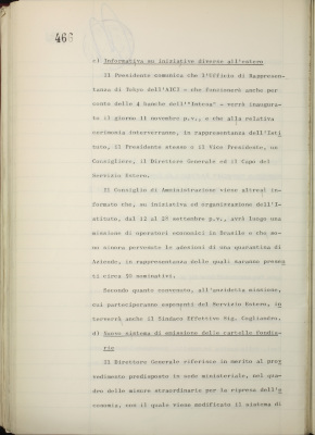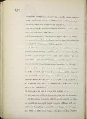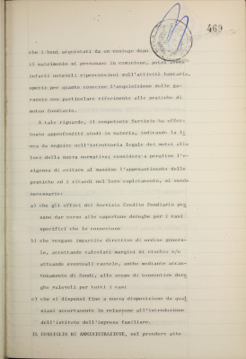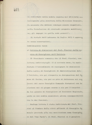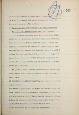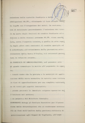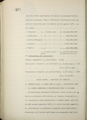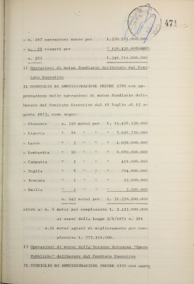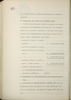 Comunicazioni varie: lettera di dimissioni del prof. Fiorini dalla carica di consigliere dell'Istituto; rappresentanti nel Consiglio di amministrazione dell'Italian International Bank Ltd., Londra; informativa su iniziative diverse all'estero; nuovo sistema di emissione delle cartelle fondiarie; estensione dell'operatività degli istituti esercenti il credito fondiario nelle zone di competenza della Cassa per il Mezzogiorno; informativa sulla riforma del diritto di famiglia; situazione dei conti al 31 luglio 1975; operazioni di fido e di mutuo fondiario deliberate dal Comitato esecutivo; operazioni mutuo della Sezione Opere Pubbliche deliberate dal Comitato esecutivo; situazione del personale