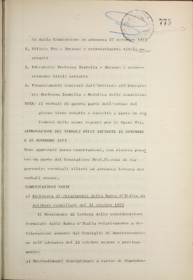 Parte seconda - Gestioni di beneficenza Ufficio pio, ratifica delle deliberazioni prese dalla Commissione in adunanza 27 novembre 1975 (verbale a parte)