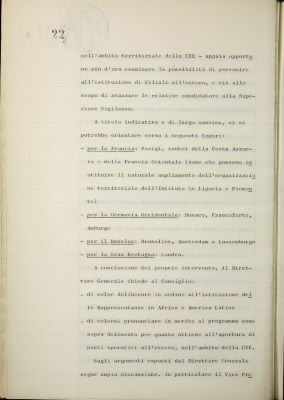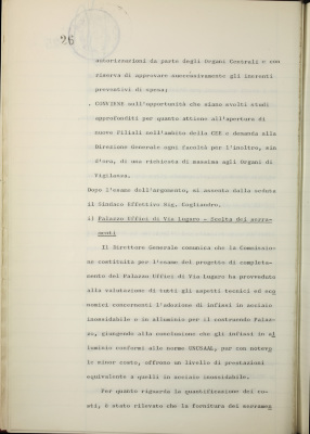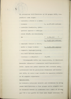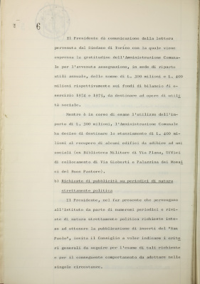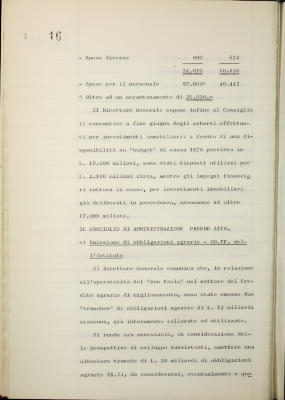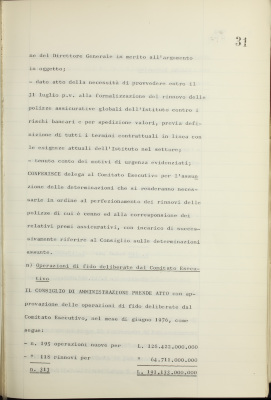 Comunicazioni varie: lettera del sindaco di Torino relativa all'utilizzo dei fondi stanziati dall'Istituto a favore del Comune, per opere di utilità sociale; richieste di pubblicità su periodici di natura strettamente politica; richiesta di informazioni da parte dei consiglieri; informativa sulla situazione dei conti al 30 giugno 1976 e sull'operatività e spese dell'istituto alla fine del primo semestre emissione di obbligazioni agrarie e OO. PP. Dell'Istituto; mutui venticinquennali alle cooperative; organizzazione e sovrintendenza della delegazione di credito fondiario di Reggio Calabria; potenziamento dell'organizzazione all'estero, linee di sviluppo; palazzo uffici di via Lugaro, scelta dei serramenti; sede di piazza San Carlo, controversia con l'impresa Guerrini; rinnovo polizze assicurative dell'Istituto; operazioni di fido e di mutuo fondiario deliberate dal Comitato esecutivo; operazioni mutuo della Sezione Opere Pubbliche deliberate dal Comitato esecutivo; situazione del personale