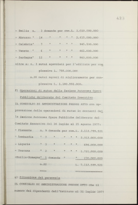 Comunicazioni varie: convegno organizzato dall'Istituto nell'ambito delle manifestazioni della fiera del levante di Bari; visita al cantiere di via Lugaro; informativa sulla situazione dei conti dell'Istituto al 31 luglio 1977; operazioni di fido deliberate dal Comitato esecutivo; operazioni di mutuo fondiario deliberate dal Comitato esecutivo; operazioni di mutuo della sezione autonoma opere pubbliche deliberate dal Comitato esecutivo; situazione del personale; plafond per l'impiego in B.O.T. di disponibilità liquide; tassi attivi e passivi