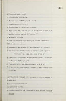 Comunicazioni varie: indagine conoscitiva sul finanziamento delle imprese industriali italiane; gruppo Liquichimica, piano di riassetto; investimento immobiliare in Monza; richiesta di incontro avanzato dalla Confederazione sindacale regionale; nomina di rappresentanti del San Paolo negli organi collegiali delle Società del Gruppo Euramerica; consorzio di garanzia per aumento del capitale SIP; prestito esterno con la Lloyds Bank International Ltd.; situazione dei conti al 30 aprile 1978; operazioni di fido e di mutuo fondiario deliberate dal Comitato esecutivo; operazioni mutuo della Sezione Opere Pubbliche deliberate dal Comitato esecutivo; situazione del personale