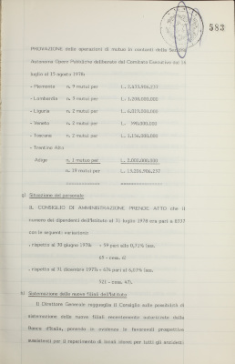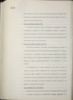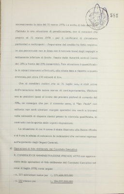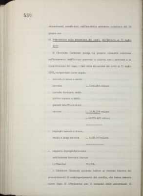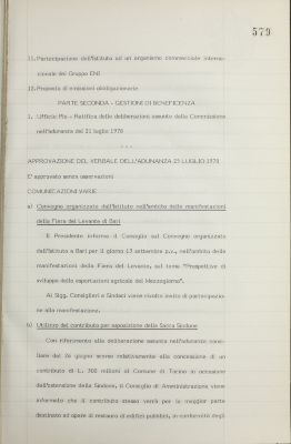 Comunicazioni varie: convegno organizzato dall'Istituto nell'ambito delle manifestazioni della Fiera del Levante di Bari; utilizzo del contributo per esposizione della Sacra Sindone; informativa sulla situazione dei conti al 31 luglio 1977; operazioni di fido e di mutuo fondiario deliberate dal Comitato esecutivo; operazioni mutuo della Sezione Opere Pubbliche deliberate dal Comitato esecutivo; situazione del personale; sistemazione delle nuove filiali dell'Istituto; analisi dei bilanci bancari 1977; risanamento delle Aziende chimiche;