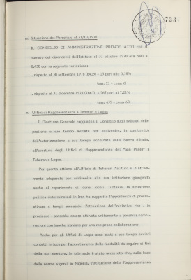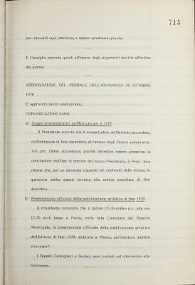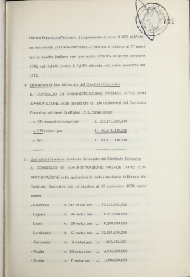 Comunicazioni varie: organi amministrativi per il 1979; presentazione ufficiale della pubblicazione artistica di fine 1978; inchiesta parlamentare sul finanziamento delle imprese industriali; riunione delle principali banche italiane presso la Banca d'Italia; attività dell'Istituto nel settore del Credito fondiario; consuntivo della spesa al 31/10/1978; informativa sulla situazione dei conti dell'Istituto al 31 ottobre 1978; operazioni di fido e di mutuo fondiario deliberate dal Comitato esecutivo; operazioni mutuo della Sezione Opere Pubbliche deliberate dal Comitato esecutivo; situazione del personale al 31 ottobre 1978; uffici di rappresentanza a Teheran e Lagos