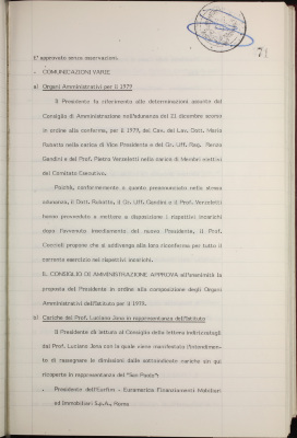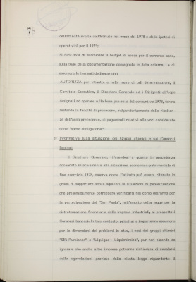 Comunicazioni varie: organi amministrativi per il 1979; cariche del prof. Luciano Jona in rappresentanza dell'Istituto; limite all'accrescimento degli impieghi bancari; operatività e spese - consuntivi 1978 ed ipotesi per il 1979; informativa sulla situazione dei gruppi chimici e sui consorzi bancari; assunzione di prestito estero; filiali estere di banche italiane; operazioni di fido deliberate dal Comitato esecutivo; operazioni di mutuo fondiario deliberate dal Comitato esecutivo; operazioni di mutuo della sezione autonoma opere pubbliche deliberate dal Comitato esecutivo; situazione del personale al 31 dicembre 1978