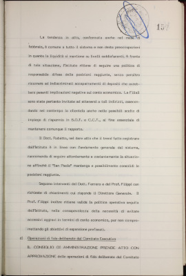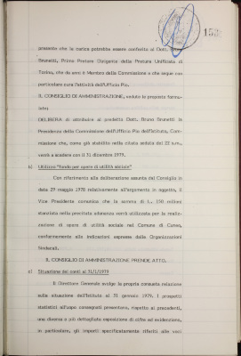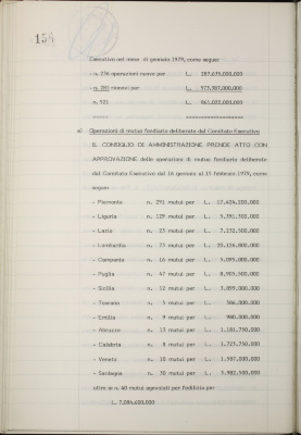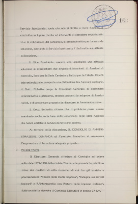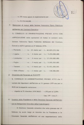 Comunicazioni varie: Ufficio pio - nomina del Presidente della commissione; utilizzo fondo per opere di utilità sociale; situazione dei conti al 31/1/1979; operazioni di fido deliberate dal Comitato esecutivo; operazioni di mutuo fondiario deliberate dal Comitato esecutivo; operazioni di mutuo della sezione autonoma opere pubbliche deliberate dal Comitato esecutivo, situazione del personale al 31 gennaio 1979; incontro della Presidenza e della Direzione generale dell'Istituto con la Delegazione aziendale della Federdirigenti, controlli interni sui servizi centrali; rivista «Thema»