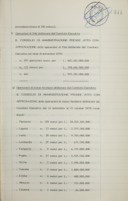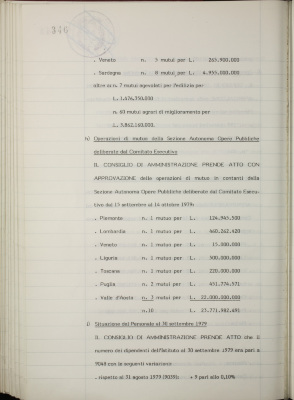 Comunicazioni varie: erogazioni eseguite sul fondo a disposizione; richiesta del consigliere Bellavita in merito alla situazione delle locazioni in corso degli alloggi di proprietà dell'Istituto e della Cassa di Previdenza per il personale; nuove condizioni dei mutui fondiari, edilizi ed OO.PP.; note sulle prospettive dell'economia italiana nel breve periodo; situazione dei conti al 30 settembre 1979; operazioni di fido deliberate dal Comitato esecutivo; operazioni di mutuo fondiario deliberate dal Comitato esecutivo; operazioni di mutuo della sezione autonoma opere pubbliche deliberate dal Comitato esecutivo; situazione del personale al 30 settembre 1979
