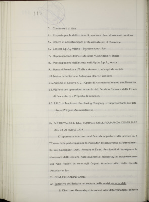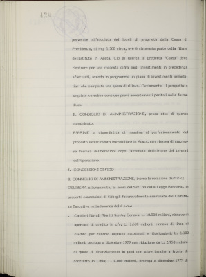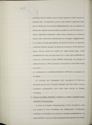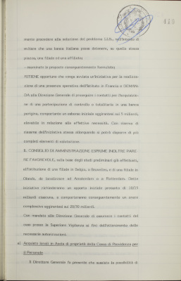 Comunicazioni varie: iniziativa dall'Istituto nel settore della revisione aziendale; condizioni mutui fondiari e OO.PP.; Istituti di Credito Mobiliare - proposte in ordine a possibili nuove modalità di finanziamento; operatività dell'Istituto all'estero; acquisto di locali in Aosta di proprietà della Cassa di Previdenza per il personale